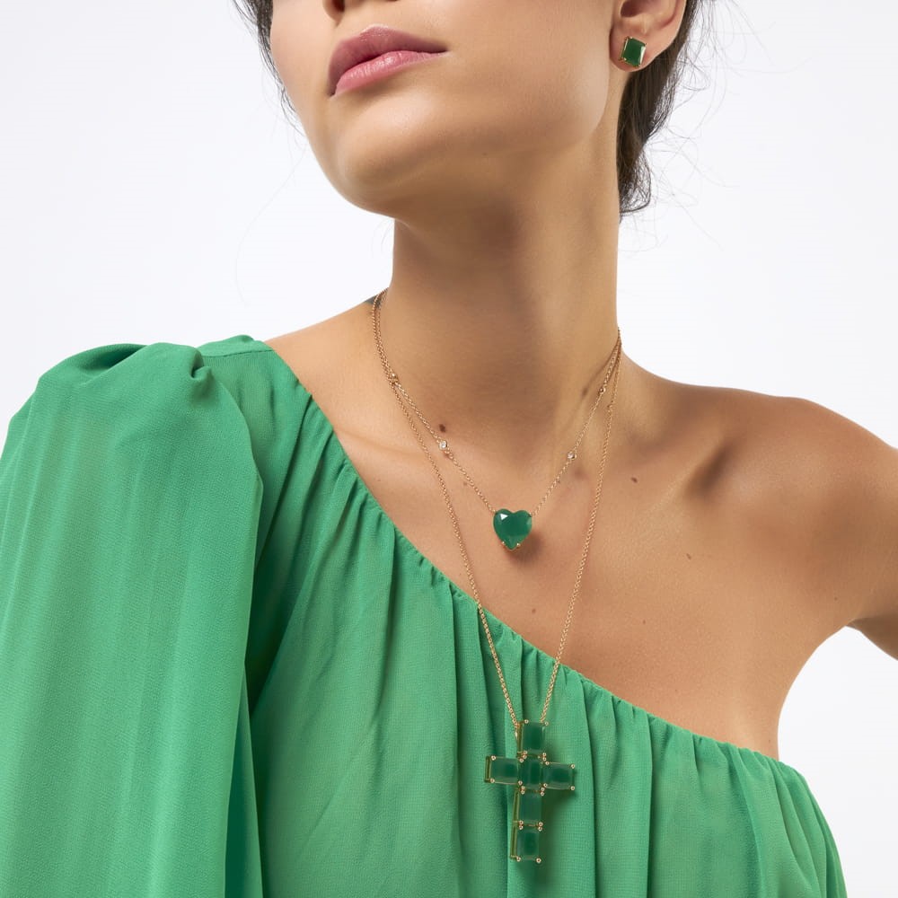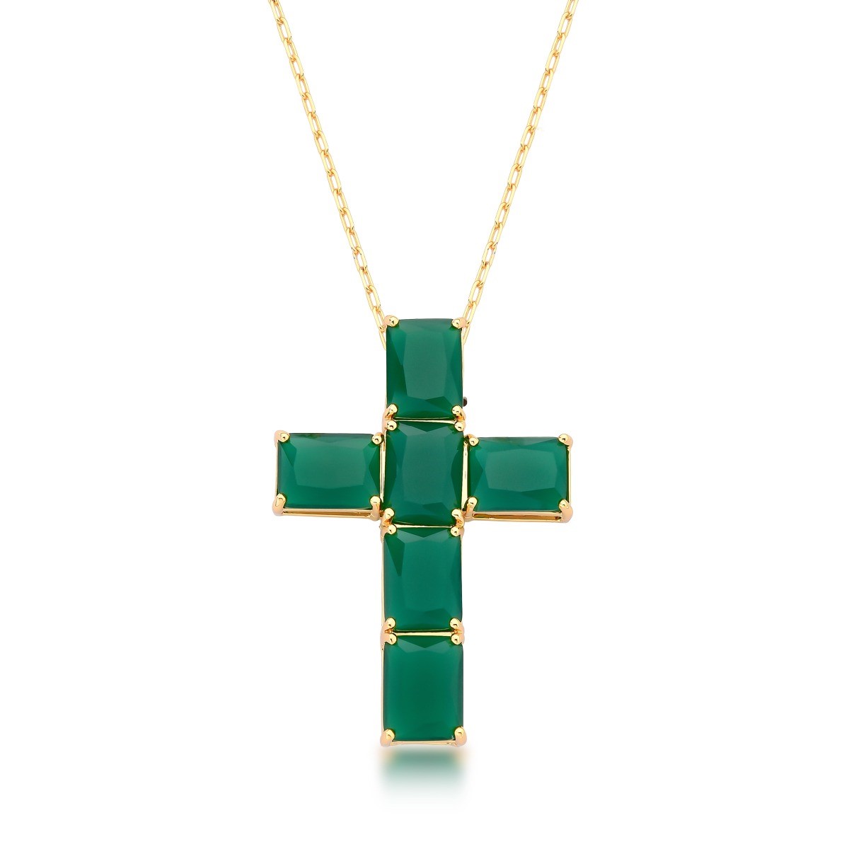 Colar Com Pingente De Cruz Cristais Esmeralda Banho 18k