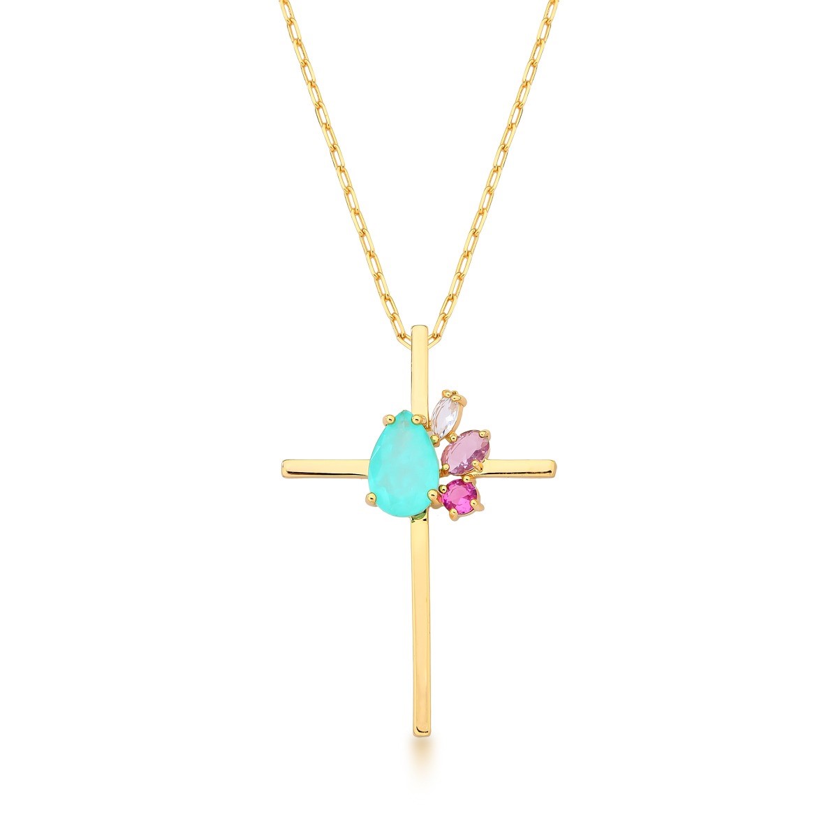 Corrente Com Pingente De Cruz Turmalina E Azul Banho 18k