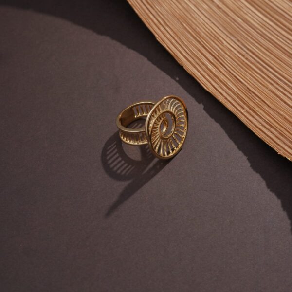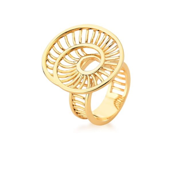 Anel oval curvo, liso, vazado e texturizado. A explosão da tendência country está representada nesta linda coleção, inspirada no velho oeste. Outras referências aos elementos dessa estética são incorporadas nesta coleção como os círculos e os designs estaiados em peças no banho de ouro 18k.