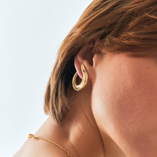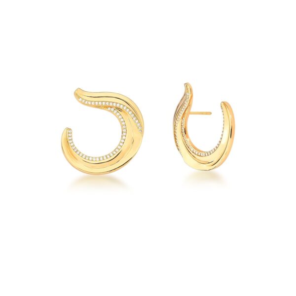 Brinco curvo cravejado de zircônias na cor branca banho a ouro 18k. O Sendo uma peça única e indispensável, ele traz modernidade e delicadeza, caindo bem em qualquer composição, desde um visual moderno até mesmo clássico.