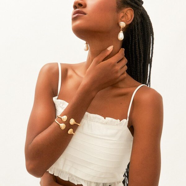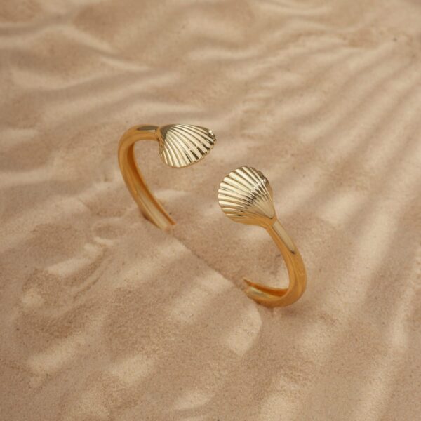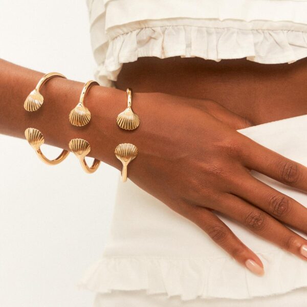 Bracelete com abertura, com conchas lisas, banho a ouro. No verão, cada dia se desdobra como uma promessa de aventuras sob o sol radiante. É a estação em que cores brilhantes dançam no horizonte, e o tempo parece se esticar em momentos de puro deleite.
