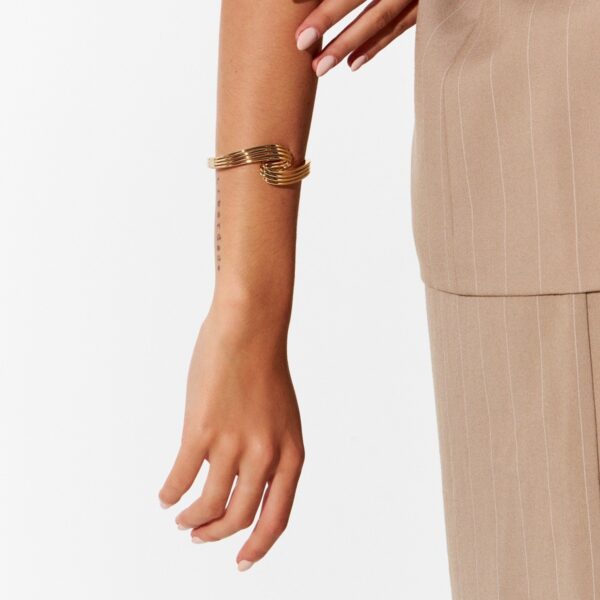 Bracelete texturizado curvo liso, com fecho de click na lateral banho ouro 18k. O Sendo uma peça única e indispensável, ele traz modernidade e delicadeza, caindo bem em qualquer composição, desde um visual moderno até mesmo clássico.